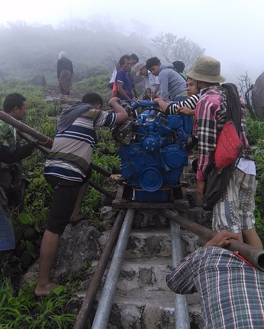 The site is a no-fly zone, which meant that the only option was to disassemble the generator set and manually carry it uphill to reassemble at the site, taking a crew of 22 people 15 days to complete.